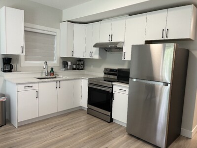 Welcome to our home! This above-ground furnished 1-bedroom suite can be rented for $2400/month or $650/week. Your landlord - a local physician - lives in the home above. Our home is a 12-minute drive from the Abbotsford Hospital, or 20 minutes from Langley Hospital. There is a full kitchen and in-suite laundry. We live in a quiet neighbourhood, backing onto green space, and you will have a private patio outdoors. You may meet our dog outside - he's very friendly! You're welcome to borrow him for some cuddles.