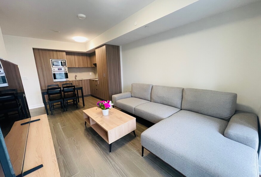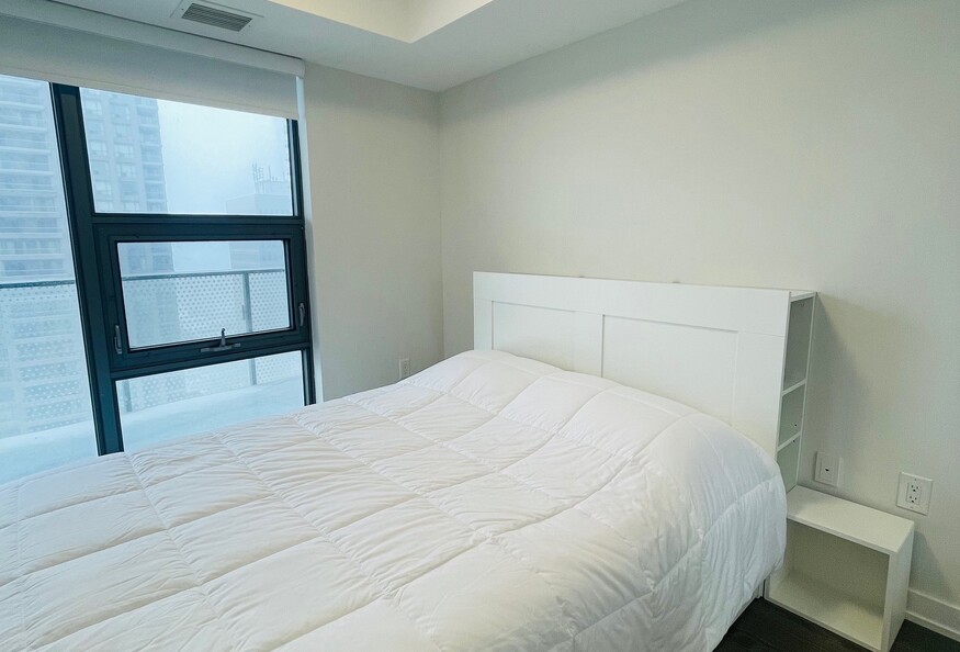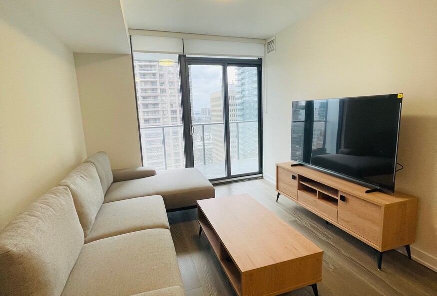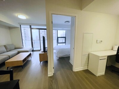 Spacious modern furnished 1 bedroom + 1 den condo in downtown Toronto across the street from TTC subway, grocery stores, and urban park. Located at 11 Wellesley St between Bay St and Yonge St, new build (2021). 579 sq ft open floorplan with 9 ft ceiling + large balcony. Panoramic unobstructed SW/W/NW floor to ceiling window views with abundant natural light. High end finishes with laminate hardwood flooring, modern kitchen with like new appliances and quartz countertop. Facilities include 24/7 concierge, fitness centre with yoga studio, indoor pool and hot tub, sauna, lounge, party room, movie theatre, outdoor terrace with BBQs, and guest suites. Furnishings include: window coverings, fridge, electric stove, microwave, oven, dishwasher, en suite washer and dryer, sectional sofa, 65” TV, coffee table, work desk, dining table and chairs, flatware / cutlery, shower curtain, bed with drawers and storage, bedsheets, lighting fixtures, vacuum. All furniture is brand new. Hydro (heating, water, electricity) and Internet all included in monthly rental. Hospitals: 4 min walk to Sunnybrook Holland Centre (with free shuttle to Sunnybrook Health Sciences Centre) 6 min walk to Women's College Hospital 12-15 min walk to SickKids, Toronto General, Mount Sinai, and Princess Margaret 20 min walk to St Michael's 35 min walk to Toronto Western or 12 min walk to Toronto General (free shuttle to Toronto Western) Public transit: 1 min walk to Wellesley TTC bus and subway station 1 min walk to Bike Share docks Green P public parking lot under condo for visitors Universities: 8-12 min walk to University of Toronto 12-15 min walk to Toronto Metropolitan University Attractions: 1 min walk to grocery stores: Rabba, Galleria 5 min walk to Church-Wellesley Village with an abundance of restaurants and bars 10 min walk to Queen's Park 15 min walk to Yonge Dundas Square and Eaton Centre 15 min walk to Yorkville shopping area *there are also dedicated bike lanes on Wellesley St, College St, and University Ave No pets allowed. Non-smoker only. Feel free to contact me