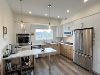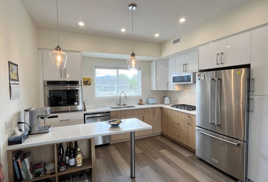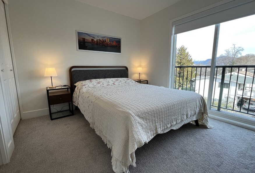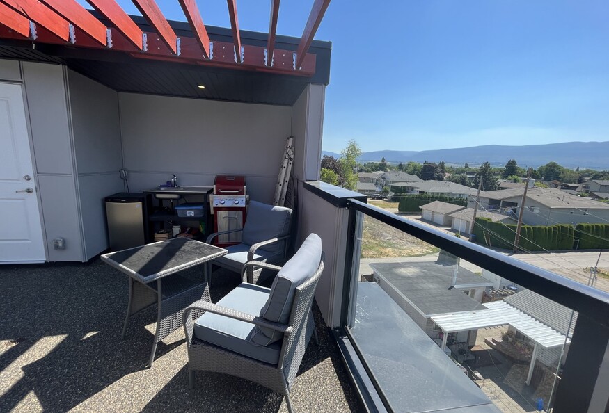 Fully furnished 2 bed 2.5 bath in small, modern townhome development. Available from 1 May - 31 August 2026. or for longer term. Ideal home for temporary or longer-term working professionals/hospital employees/mature students etc. looking for urban lakeshore lifestyle. Sought-after location in Pandosy village - less than 10-minute walk to KGH, shops, parks, beaches, and Okanagan College. 4 min walk to bus stop direct to UBCO. Cycle routes connect to downtown and many other areas Entry level has a large garage suitable for one vehicle and plenty of storage. Also unrestricted street parking out-front. Main floor has open plan fully fitted kitchen with all appliances, dining and living area with lots of natural light. 3rd floor has queen bedroom with attached bathroom; second queen bedroom with ensuite shower; and premium washer/dryer. The unique feature is a spacious, very private 4th floor rooftop patio with extensive views of the city and mountains. Includes seating, bbq, planters, sink and outdoor fridge to enjoy outdoor living for 8 months of the year. Simple admin with Internet, gas and electricity included in rent. Water, garbage, snow removal included. This is a quiet complex - no smoking or parties. Half month's rent as deposit. Tenant insurance recommended. References, proof of income and/or employment may be required. Professional cleaning fee on departure. Caring and experienced private landlords.