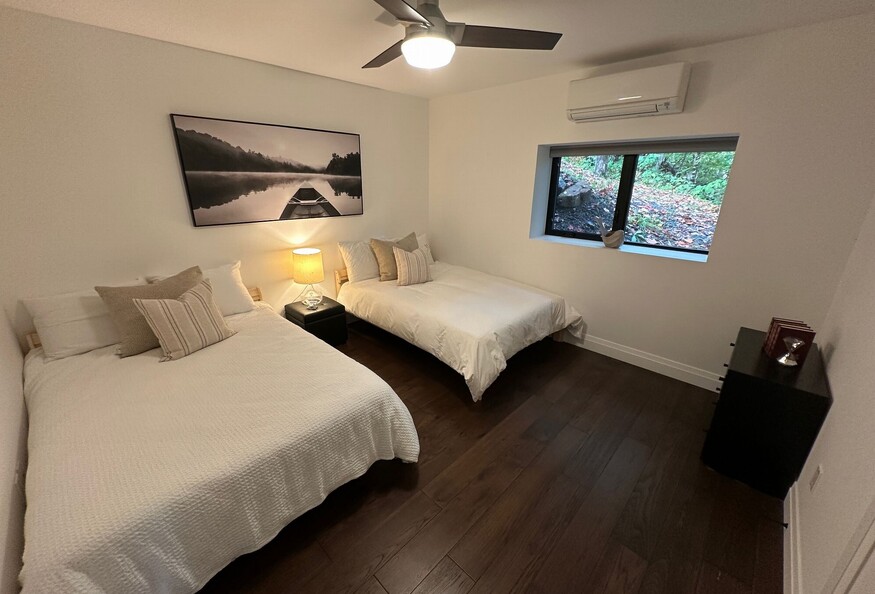 A modern, fully furnished, 900sqft, self-contained apartment. Within 17 mins of Huntsville Hospital. Located on the shores of Lake Vernon in 4.3 private acres of forest. It is attached to the main house but with a separate entrance and located under the garage so it is very private. The apartment has its own separate patio with access to Lake Vernon. One bedroom has a queen bed. Second bedroom has 2 double beds. Individually controlled heat and A/C. Fully stocked kitchen with a fridge, range, dishwasher, microwave, pots & pans, dishes, etc. Washer and dryer in unit. 50” 4K SmartTV with AppleTV. Automatic backup generator. All utilities plus Gigabit internet and parking are included. 30 day minimum rental.