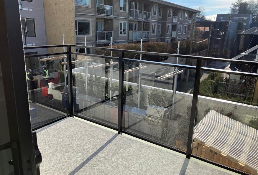 2 bedrooms+den and 2 bathrooms in a new boutique building, 5 min walk from Commercial Drive sky train station, (central location in Lower Mainland with access to two skytrain lines), 3rd floor, windows facing south and west towards the courtyard and away from the busy streets.