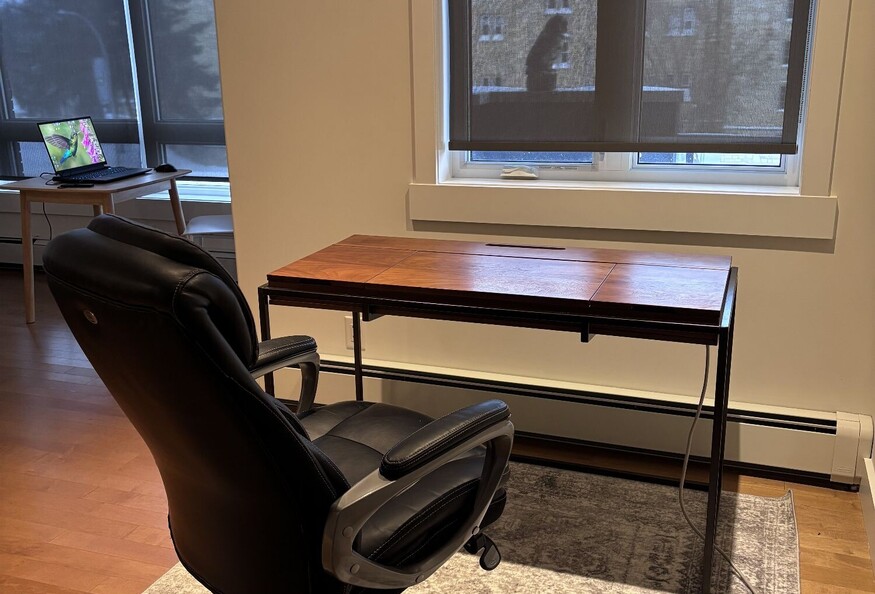 Incredible closet space. In second bathroom: best shower I've ever had. Queen bed. Desk & office chair. Apartment is on 2nd floor -- there's an elevator.
