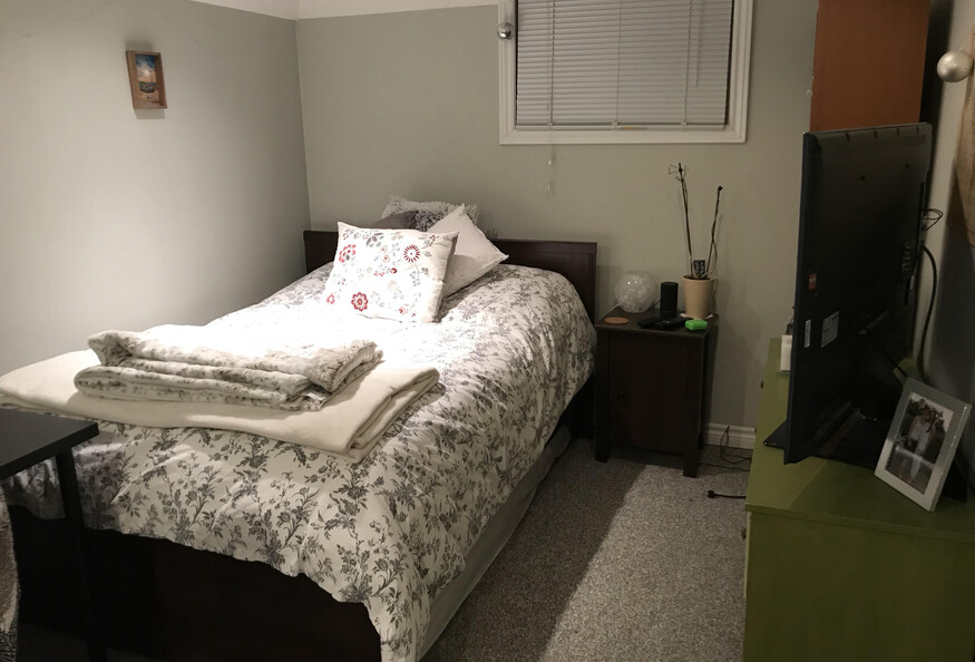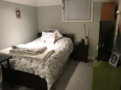 Bachelor apartment located in a private home. Fully contained with kitchen, living room and bedroom in one large space with a separate bathroom recently renovated to include both a bathtub and shower. Air conditioned unit, well lit with ceiling pot lights and with 3 windows. Includes all utilities plus internet. Apartment comes furnished with bed, dresser, table & chairs and sitting area. Has a spacious closet. Kitchen includes refrigerator, stove and microwave. Washer and dryer is shared with upstairs homeowner. Renter must provide own linens and towels. On-street parking is available. Large spacious backyard with lots of places to sit. No pets, candles, smoking, vaping or cannabis. Note: there are 2 cats that reside in the owner's area.