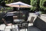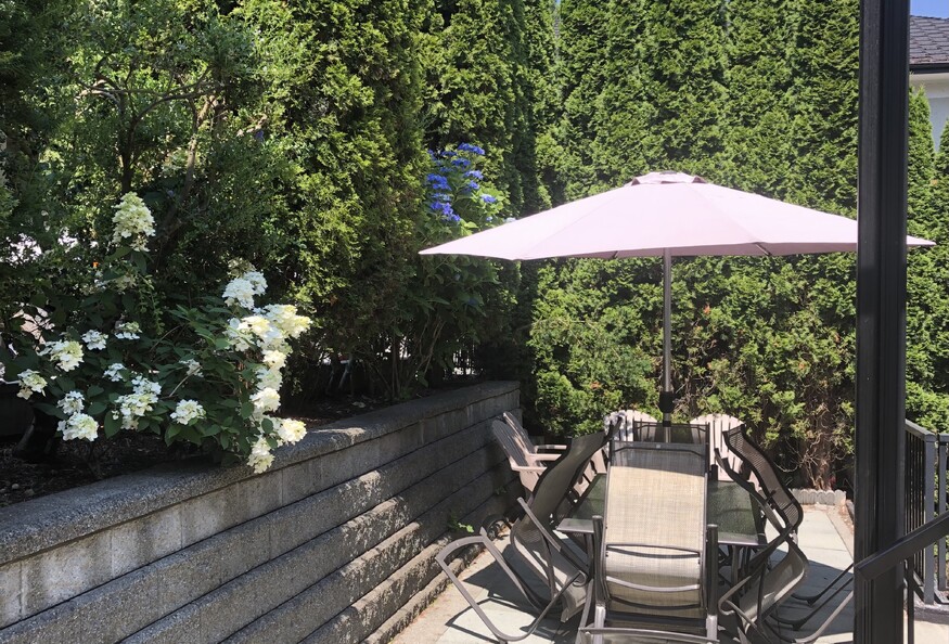 Large backyard garden with patio tables and chairs