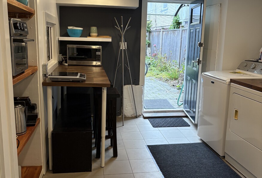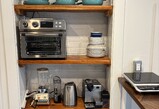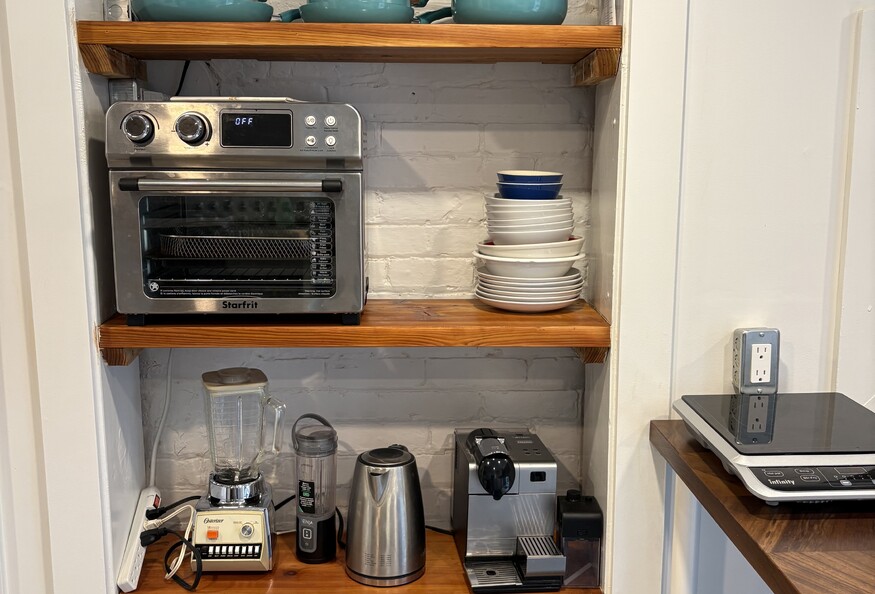 Kitchen includes a Nespresso machine, air fryer, hot plate, microwave, small appliances, pots, pans, dishes and cutlery.