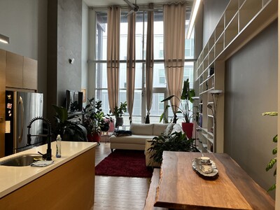 $2850/month all utilities included, fully furnished, house keeping provided biweekly. Move in March 1 2026 or after. Rent this fully furnished loft in the heart of Kelowna's downtown core. This condo is 2 blocks away from the beach boardwalk, city marina, parks, restaurants and trendy shops. The city library, Centre for the Arts, Prospera Place, Laurel Packing House, Delta Grand Resort and Casino are also within a 1-2 block radius. KGH is a 20min walk or 7min bike ride, Big White Ski Resort is a quick 45 minute drive out of town, while Silver Star Ski Resort is 70km in the opposite direction. This top floor loft passes lots of natural light through its 20' high windows in the mornings, and allows for shaded afternoon as it is east facing. It has 2 bedrooms 2 bathrooms + den, with the king size master bedroom on the 2nd floor, and a queen size 2nd bedroom made private with sliding doors on the 1st floor.
