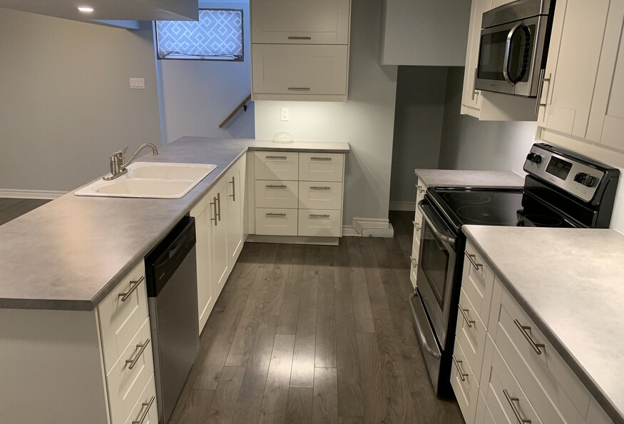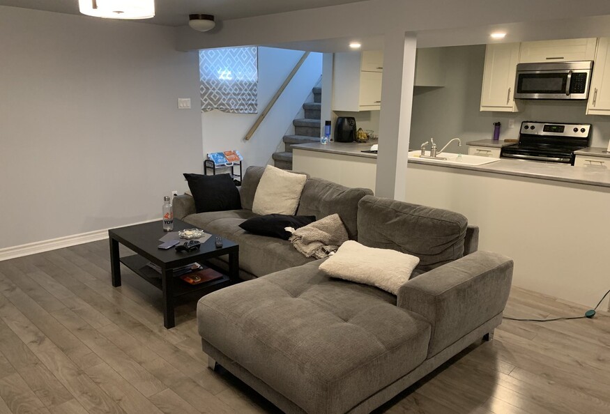 A professionally designed to modern occupancy and fire specification, legal dwelling unit. 1100 sqft of living space including an open concept living room, dining room and kitchen, two bedrooms and a large bathroom. Ample interior and outdoor shed storage. The unit is fully equipped with stainless steel appliances (dishwasher, microwave, stove, fridge), central AC and an in-unit washer dryer. Many recent upgrades including heat pump, disheasher, washer dryer. Included with the rent are: hydro, water, heat, two parking spaces, and snow removal service. Tenant must pay for internet.