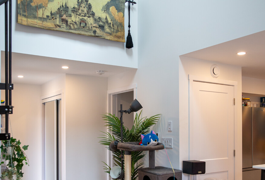 The house is 2 floors. Main floor has a living room with 55" smart TV, sofa, bathroom with shower, full sized washer and dryer, and large kitchen. The kitchen is equipped with stove, microwave, dishwasher, fridge/freezer, toaster, kettle, and air fryer, as well as all the supplies you need. The 2nd floor loft is accessed via a spiral staircase. There's a king sized bed with premium mattress, desk, and storage. You'll always be comfortable with air conditioning, heat pump, a heat recovery ventilator for clean air , and an oversized water heater. Rental includes all utilities: electricity, water, and Internet (fibre).
