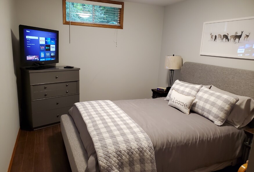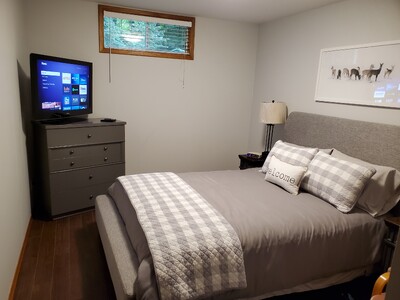 This executive furnished suite is located in a large Muskoka Lake house. It features a separate drive, covered walkway and entrance through an included Muskoka Sunroom. There is an open concept living room and kitchen with 75" wide screen TV, large sectional couch that changes to a queen guest bed, dishwasher, microwave, coffee bar and large fridge with built in ice maker. A direct hallway leads you to the laundry, primary bedroom and ensuite bath with double vanity. This property is located 6.1 km from South Muskoka Hospital and 1 minute from hwy. 11 that goes strait to Huntsville Hospital. Included is access to a large party dock with access to canoes and kayaks. Spence Lake and the South Muskoka River system form part of one of Ontario's greatest paddling experiences. A Weber BBQ is included. There are hiking trails in the neighbourhood.