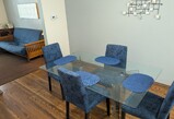 2 storey home, with front porch and private backyard. Bright, fully equipped kitchen with south-facing windows. Dining room and living room feature beautiful hardwood floors and include dining table, chairs, couch, and large smart TV.
