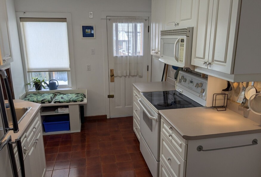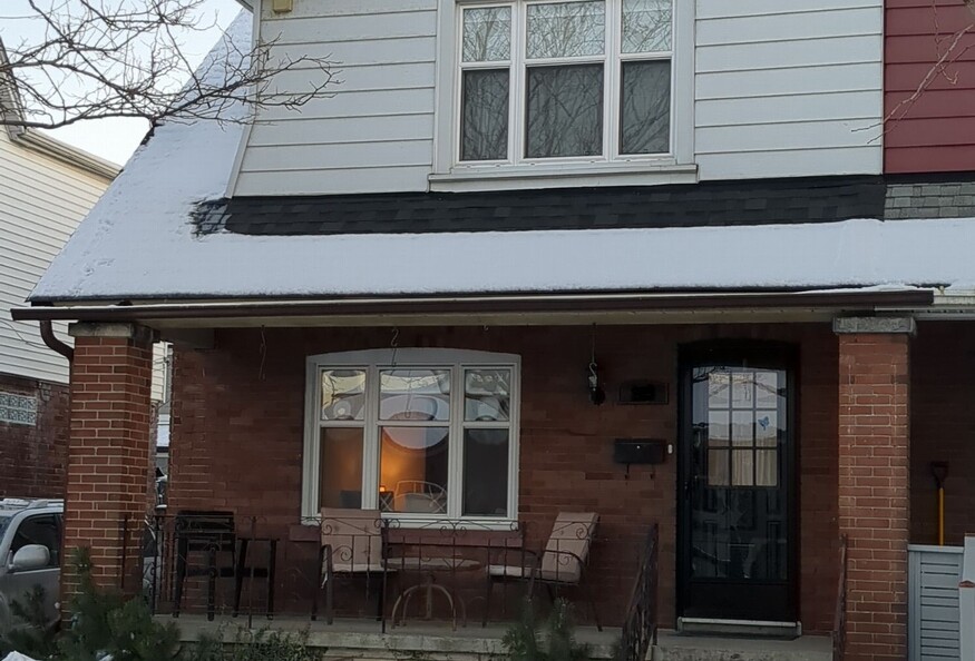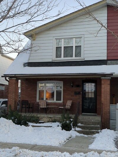 2 storey home, with front porch and private backyard. Bright, fully equipped kitchen with south-facing windows. Dining room and living room feature beautiful hardwood floors and include dining table, chairs, couch, and large smart TV.