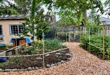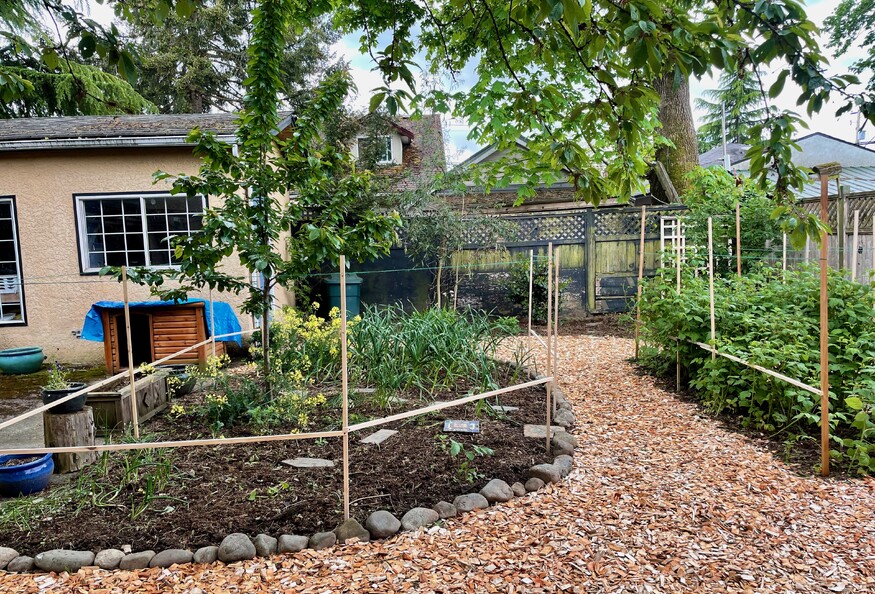 The property has been naturally landscaped with organic gardens, fruit trees, vegetables, and native plants rather than manicured lawns. The neighbourhood is older and diverse — not suburban or polished — but generally quiet and friendly.