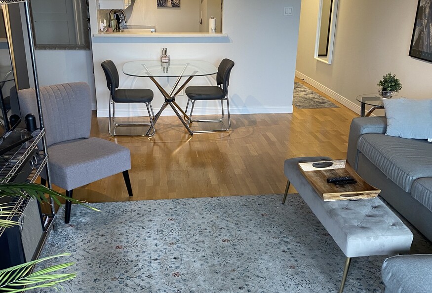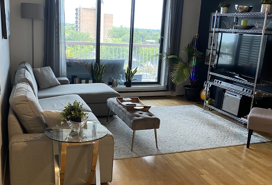 • A sun-filled open-concept living space with large south-facing windows, a comfy sectional with lounger, and a 50” TV with IPTV—perfect for cozy movie nights or lazy afternoons with a good book.