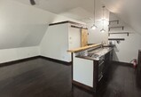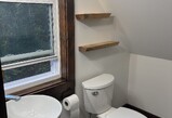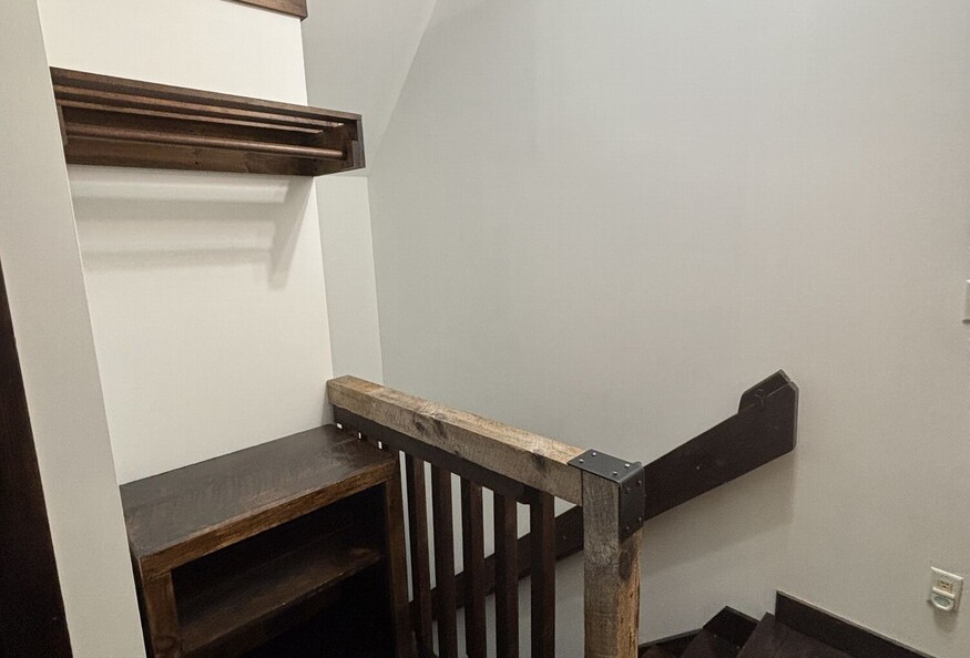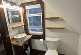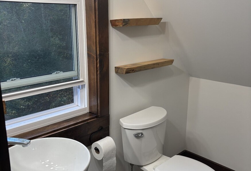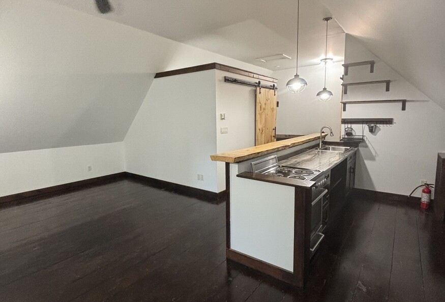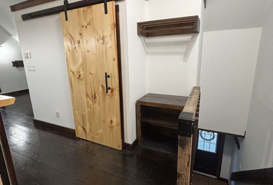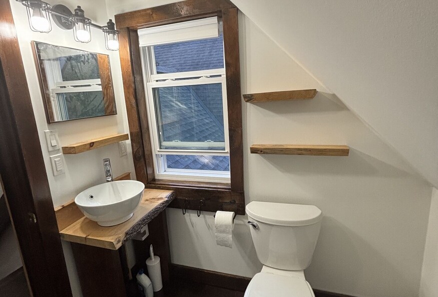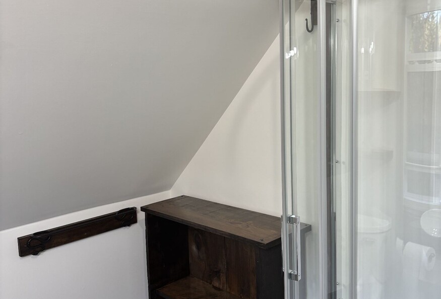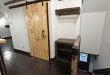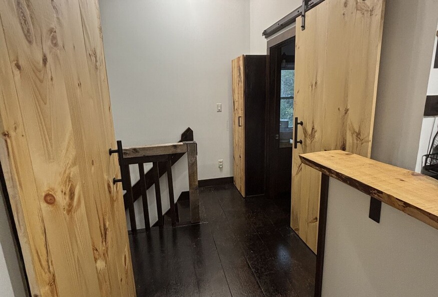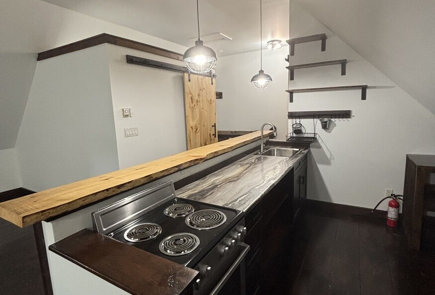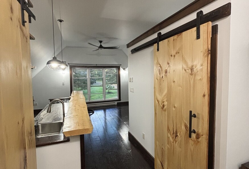 Vaulted ceiling, open concept with full kitchen, live edge bar, pine plank floors, sliding barn doors, three piece bathroom (shower only), separate bedroom. Wash and fold laundry service in Bracebridge.