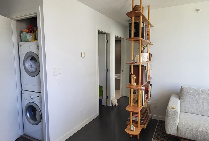 One bedroom plus flex space condo at Olympic Village, near Canada Line skytrain stop. $2100 per month includes heat and hot water and gas. This SW-facing 1 Bed + Flex unit features a functional layout with no wasted space. Kitchen highlights include stainless steel appliances with commercial grade Viking gas range and convection oven, LG refrigerator, front-loading