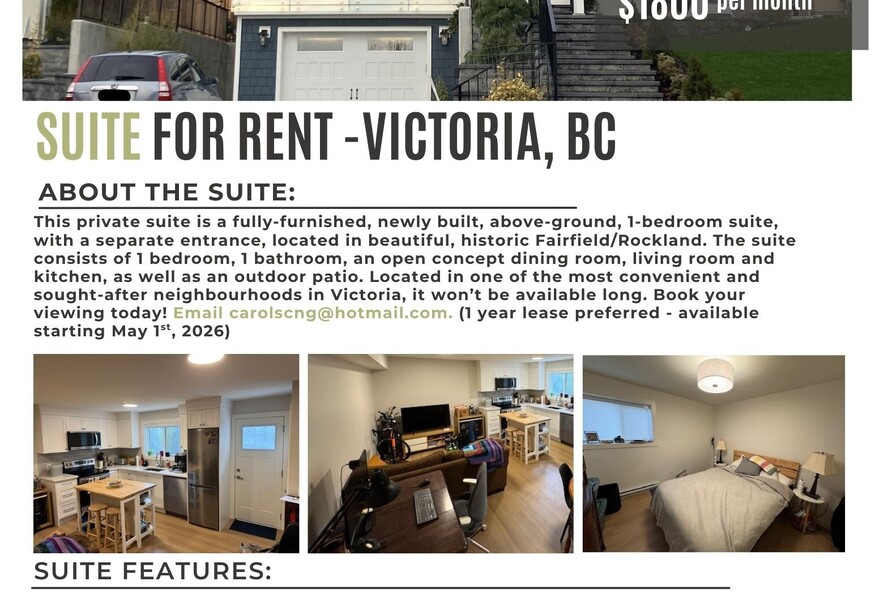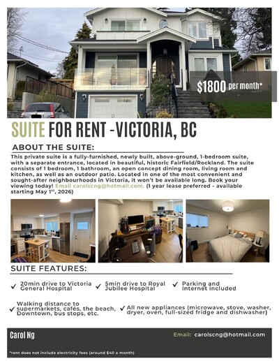 Brand new custom build home, with above ground 1 bedroom suite with lots of light from 2 large windows. Separate outdoor patio for sitting and BBQ if desired. New appliances: dishwasher, microwave, electric stove and en suite washer and dryer. Parking and internet included with rent. Hydro separate approximately $30-50/month. 5 minute drive to Royal Jubilee hospital; 15min drive to Victoria General Hospital and walking distance to supermarket and bus lines. Beautiful neighborhood of Fairfield, close to beaches and downtown. Enjoy West coast living at its best.