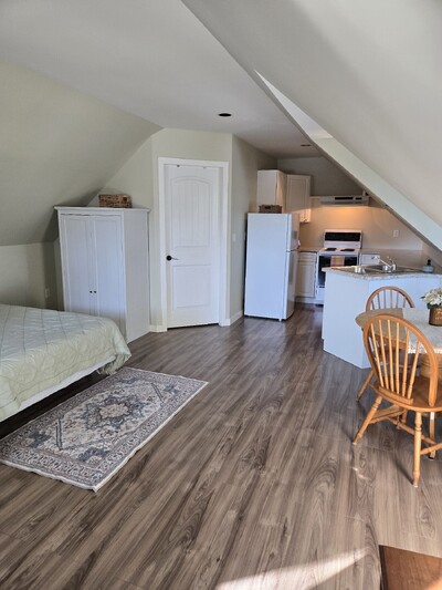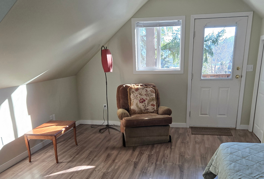 Located at the North end of the Cowichan Valley, near Highway 18 on a quiet rural road. The 600 square ft suite sits above a garage, tucked within the trees, with a private stair access entry with small patio and parking for one vehicle.