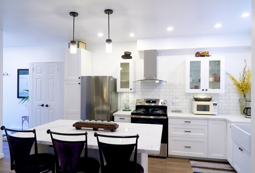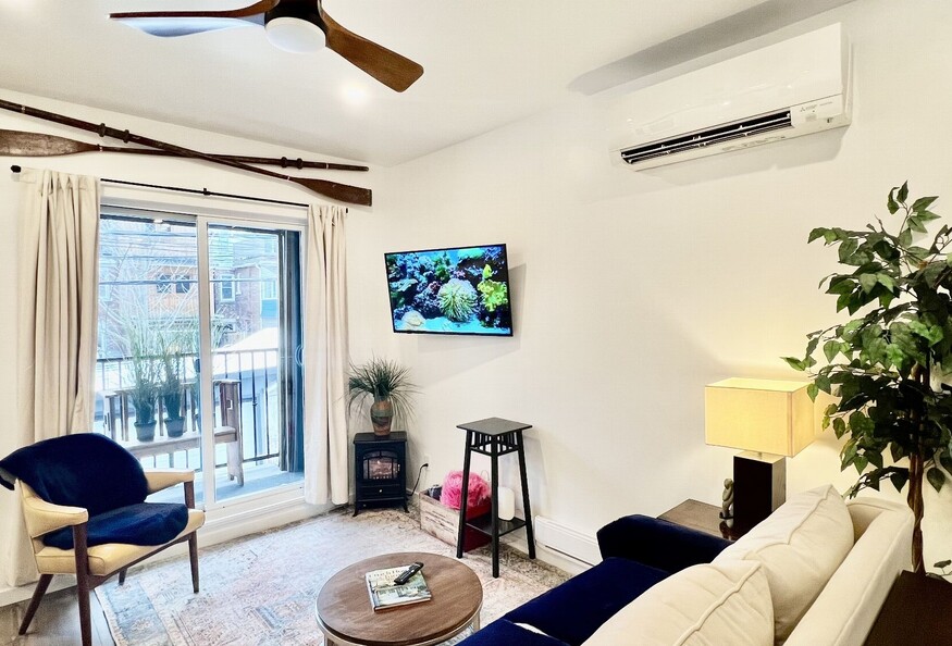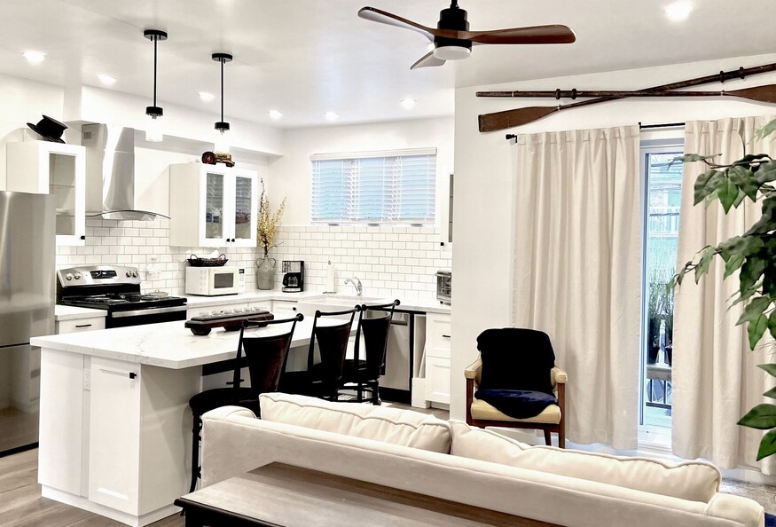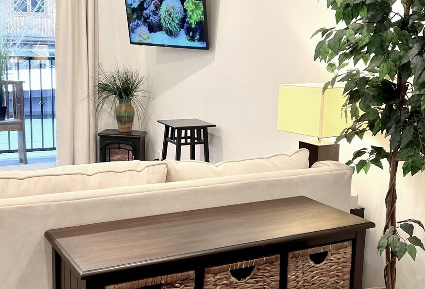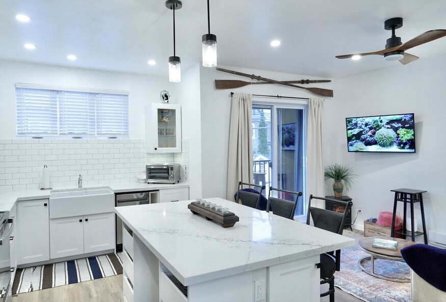 With 9' ceilings, this white, clean, bright open concept jewel has one bonus feature after another. The full-size kitchen with it's crowning white subway tile surround has a beautiful porcelain white, deep, double wide Sinkology Farm Sink, full size fridge/freezer, microwave, toaster oven/air fryer, rice/vegetable steamer, waffle maker, coffee maker and kettle. The kitchen contains all the glassware, cups, silverware, plates, bowls, cookware, bakeware, linens, soap and items that you might need with plenty of extra room for any food items you may pick up for your stay. And the large island counter has 3 cushy swivel stools around it to provide a comfortable place to eat. There is a double love seat and coffee table in front of the electric fireplace with a wall-mount Smart TV that adjusts for viewing from any spot in the suite. And High Speed Wifi, Bell Fibe TV app, Apple TV and Prime are all complimentary for you to enjoy. An array of convenient wall hooks, an empty hanger-filled closet with shelves and a convenient basket dresser are at your service as well. The bathroom has a marble tiled floor, tiled shower with glass bifold-door enclosure and a wall cabinet for your personal items as well as a large mirrored medicine cabinet with storage space. Towels, hand towels and wash cloths are provided. Parking may be available depending on size of vehicle and for an additional fee.