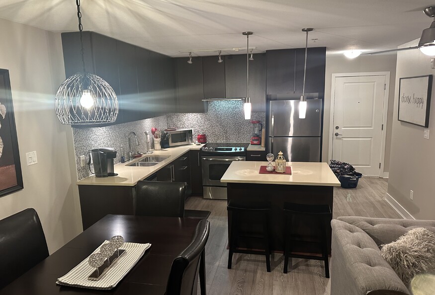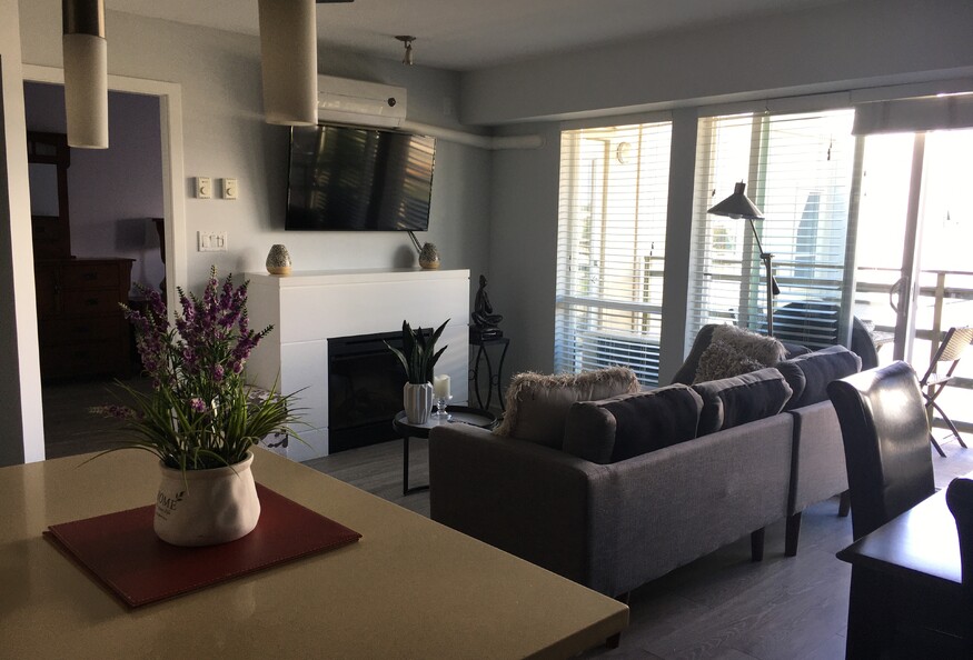 Make yourself at home in this 1 bedroom plus den, 1 bathroom South Surrey condo rental at The Shops at Morgan Crossing. With 793 square feet of living space, enjoy all that this suite has to offer, with an open concept layout, expansive windows, ample natural light, air conditioning and an electric fireplace. An expansive patio can be accessed from the main living room and master bedroom and offers plenty of room for lounging outside in the summer months. The avid cook will benefit from the L-shaped kitchen with an island, which offers stainless steel appliances, plenty of pantry space and a breakfast bar (island). Make your way into the bedroom, where you will a large window and ample closet space. In-suite laundry and room for extra storage. Storage locker underground. Amenities include underground parking with one assigned stall along with visitor parking stalls. Please note that a $200 move-in fee may apply. Located in Morgan Crossing, this South Surrey apartment rental is steps away from incredible shopping, dining and amenities. Enjoy having everything you need right at your doorstep as well as a close proximity to Sunnyside Park and local transit routes. FURNISHED and equipped with everything you need(dishes, glasses, cutlery, electric... you name it. All you need is your clothing and personal items! Credit check, employment check, reference check. No rush to rent. Looking for the proper fit! Tenant references available!