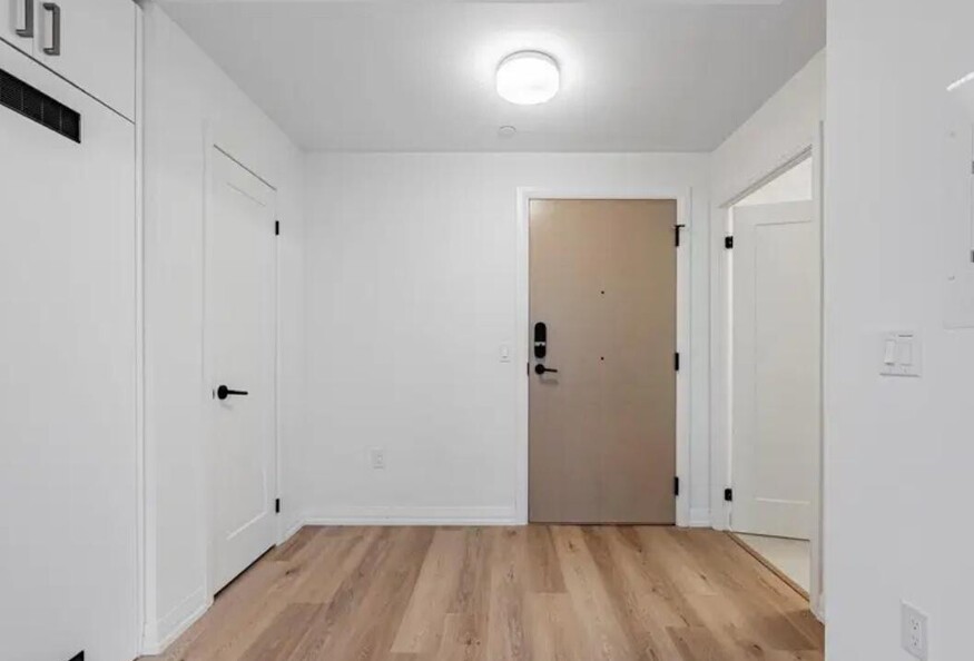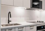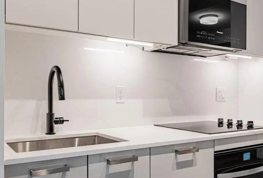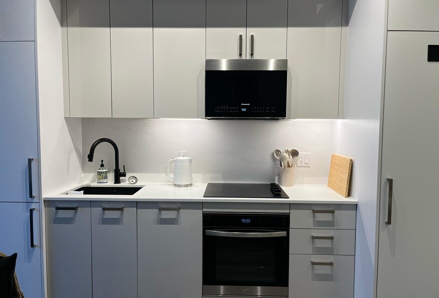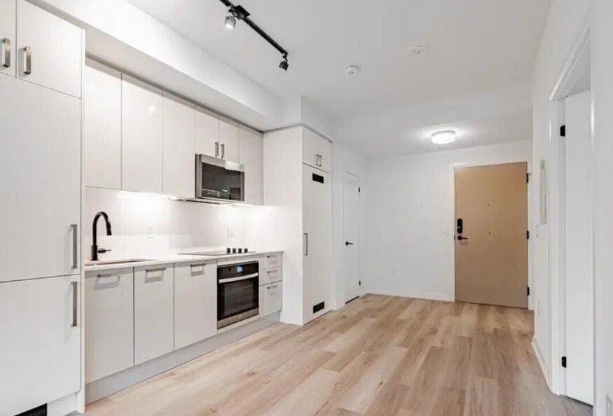 Executive Finishes: Sleek, modern kitchen with built-in stainless steel appliances, quartz countertops, and a functional open layout, plus in-suite washer and dryer.