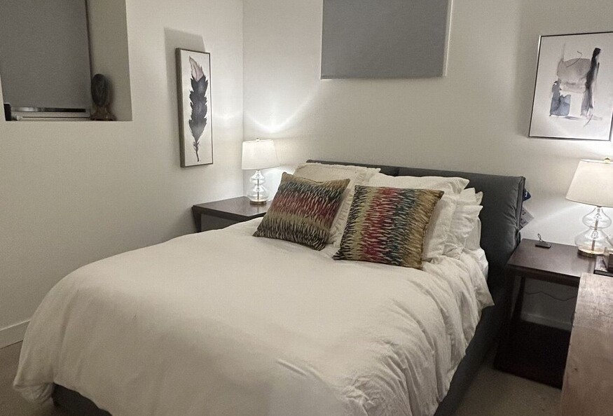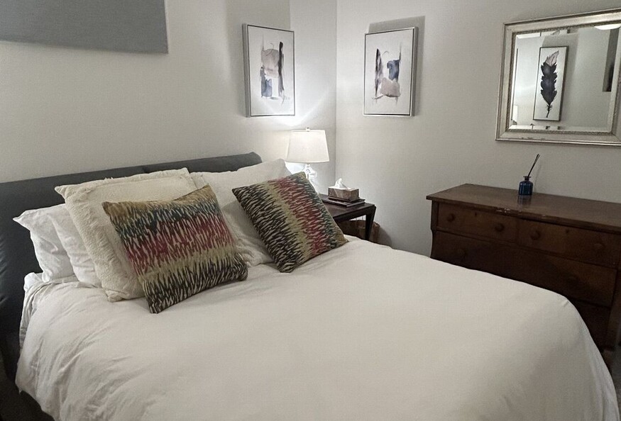 A beautiful bedroom with fine linens, down duvet and comfortable mattress (new Feb 2026).