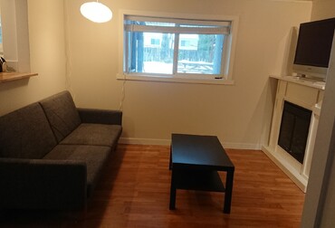 In the backyard, you have a furnished patio space, the perfect place to relax, enjoy a morning coffee or an evening meal/cocktail. The kitchen is fully stocked with all you will need for a comfortable stay, including a coffee maker, electric kettle, toaster, microwave, etc. The living space includes a comfortable couch with a pull-out queen bed, a smart TV with HDMI cable, a gas fireplace, a large window and desk area. The bedroom has a queen-sized bed and large window. There is a shared washer and dryer located in the garage with access directly from the suite.