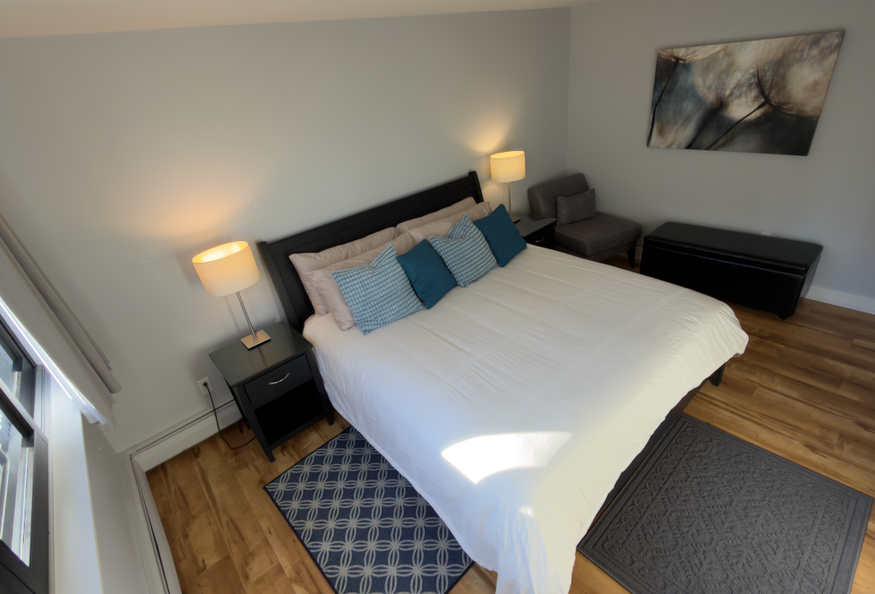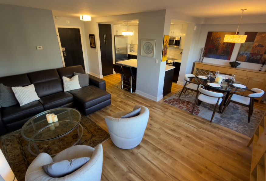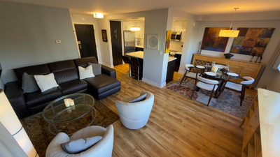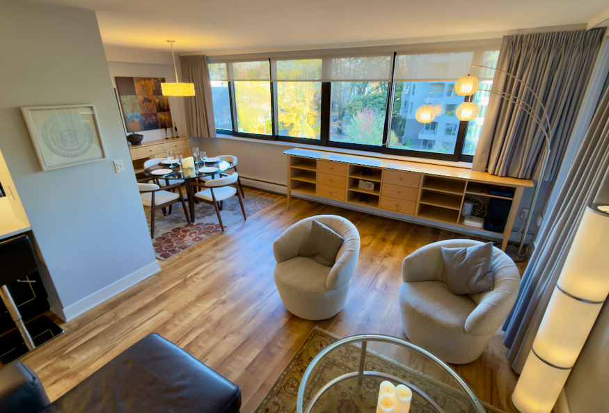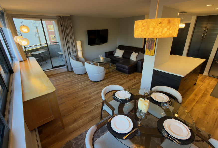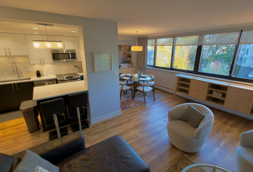 Set at 13th Avenue and Fir Street, this well-kept corner suite offers an easy, open layout that makes day-to-day living simple. The kitchen features stainless-steel appliances, plenty of cupboards, and an island that doubles as a breakfast bar. A nearby dining area seats four to six, and the bright living room—framed by floor-to-ceiling windows—comes furnished with a leather sectional and mounted flat-screen TV for relaxed evenings.