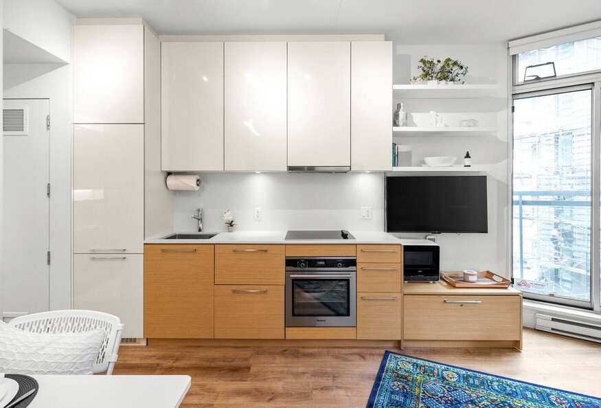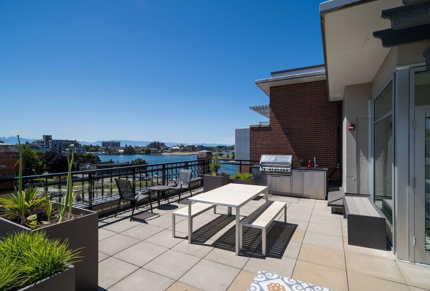 Experience the perfect blend of heritage charm & modern sophistication in this studio at The Janion, an iconic landmark in the heart of downtown Victoria. Step inside to soaring 10' ceilings, expansive windows, new flooring, loft storage, an electric fireplace & a new wall bed system. Modern art adds to the vibrancy of the microloft. The sleek, designer kitchen features quartz countertops & integrated appliances (dishwasher/refrigerator/freezer), while the spa-inspired bath has a luxurious walk-in shower. In-suite laundry adds convenience to your daily routine. A sliding glass door overlooking the waterfront. Unwind & enjoy ocean & city views on the magnificent rooftop patio with BBQ/dining areas, stay active in the fully equipped gym, or launch/store your kayak from the private beach. Located just steps from Chinatown, world-class restaurants/pubs & microbreweries, boutiques & everything that downtown has to offer. The Janion Building possesses a rich history, initially constructed in 1891 and later transformed into a sustainable residential complex through meticulous renovation and restoration.