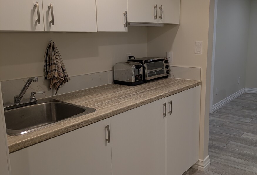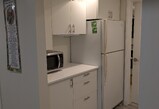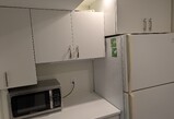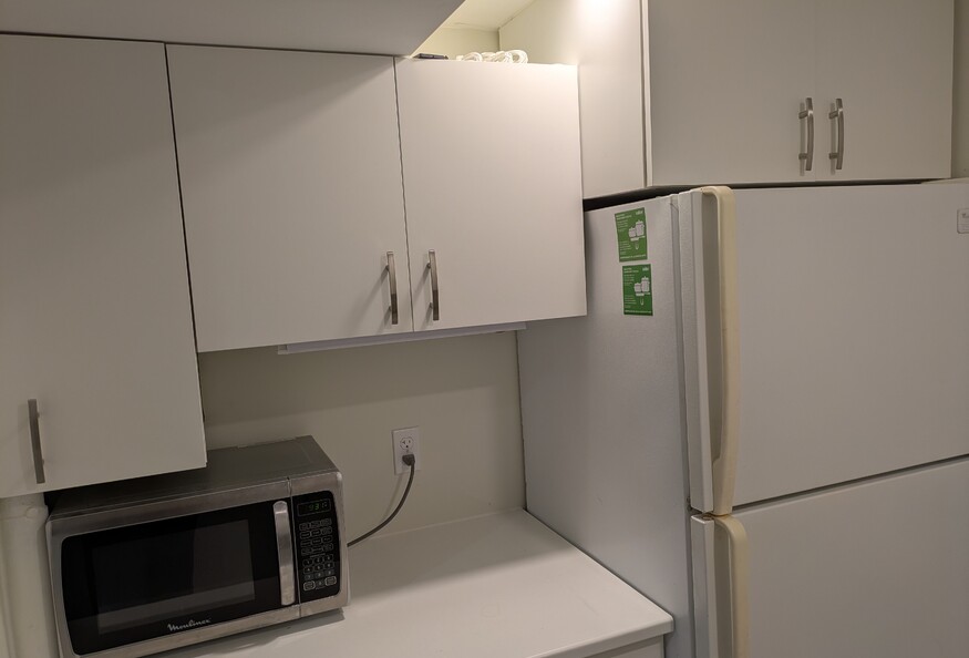 - Kitchen includes appliances: full size fridge, microwave, toaster oven, and toaster.